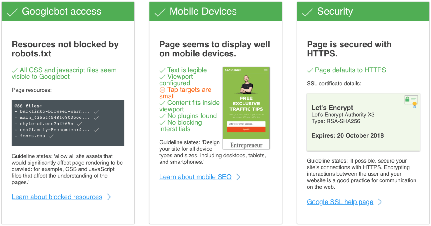 و البته این را هم به شما اعلام می‌کند که آیا سایت شما برای الگورتیم جدید گوگل آماده است یا خیر.