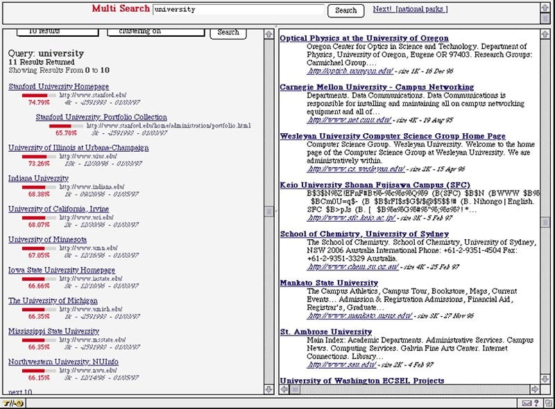 در مقاله دومی که موسسان گوگل منتشر کردند، پیج رنک را از همه نظر با یکی از بهترین و محبوبترین موتورهای جستجوگر آن زمان مقایسه کردند! این مقاله شامل یک تصویر است که دو موتور جستجو را با کلمه “دانشگاه” مقایسه میکند.