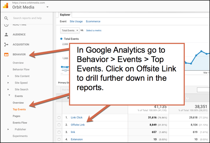 مسیر مورد نظر در گوگل آنالیتیکس Behavior > Events > Top Events > Offsite link