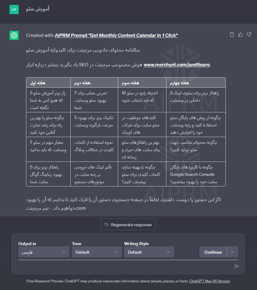با استفاده از افزونه AIPRM و امکانات پیشرفته آن، میتوانید تحقیقات کلمات کلیدی را بهبود بخشید و به موفقیت بیشتر در بهینهسازی محتوا و سئو وبسایت خود دست یابید. با دریافت پاسخهای دقیق و مفید از ChatGPT، شما میتوانید به بهترین کلمات کلیدی برای جذب ترافیک مربوطه و بهبود رتبهبندی وبسایت خود دست یابید.