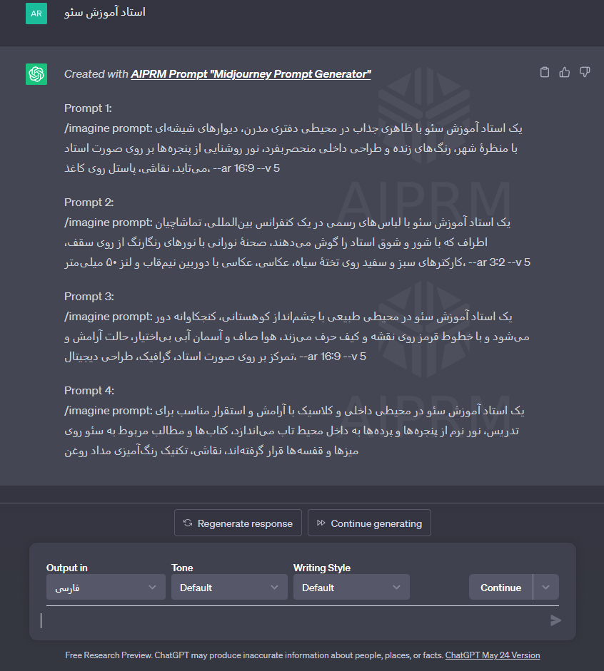 با استفاده از افزونه AIPRM، شما میتوانید پرامپتهای بسیار حرفهای برای سایتهای هوش مصنوعی تصویری مانند Midjourny بنویسید. با استفاده از ChatGPT و تعامل با این افزونه، شما میتوانید سؤالات و درخواستهای مرتبط با عکسها و تصاویر را ارسال کنید و پاسخهایی را دریافت کنید که از طریق آنها میتوانید پرامپتهای حرفهای و کیفیت بالا برای عکسهای خود ایجاد کنید.