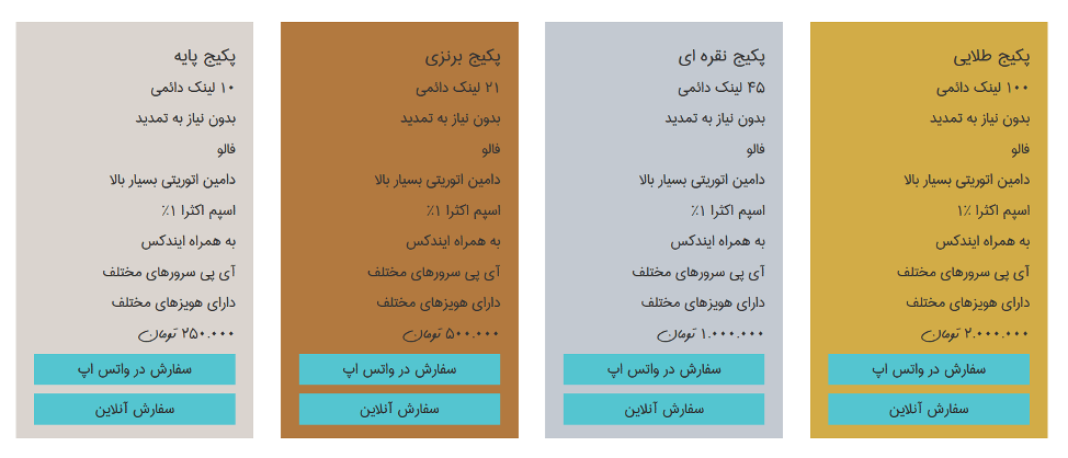 در ادامه قیمت‌هایی که برای خدمات این سایت از بهترین سایتهای فروش بک لینک در ایران ارائه‌شده‌اند را مشاهده می‌کنید: