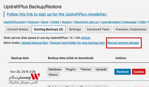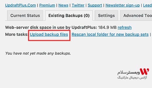 این گزینه شما را به صفحه پشتیبان گیری هدایت میکند، UpdraftPlus سرور شما را اسکن میکند تا ببنید که آیا میتواند یک پشتیبان موجود در /wp-content/updraft/ folder در وب سایت پیدا کند.