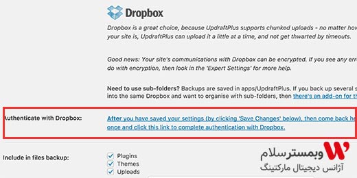 در ابتدا کافی است روی گزینه Dropbox کلیک کنید و سپس در پایین صفحه روی Save Change کلیک نمایید. در این حالت UpdraftPlus تنظیمات شما را ذخیره میکند اما شما همچنان به بروزرسانی دسترسی ها به حساب دراپ باکس خود نیاز دارید. کافی است به پایین اسکرول کنید و روی لینک کنار (Authenticate with Dropbox) کلیک نمایید.