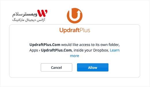 البته UpdraftPlus صرفا به پوشه مربوط به خودش در دراپ باکس اجازه دسترسی دارد. پس نترسید و به این افزونه اجازه دسترسی بدهید.