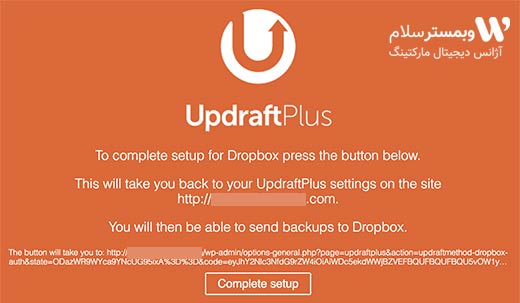 پس از آن شما به وب سایت UpdraftPlus منتقل میشوید که در آن با کلیک بر Complete Setup، تنظیمات را به پایان خواهید رساند.