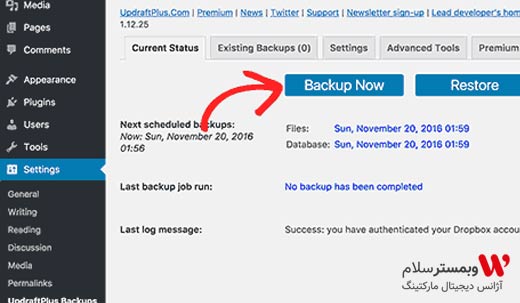 برای این کار میبایست به تنظیمات UpdraftPlus بروید و بر روی گزینه (Backup Now) کلیک کنید.