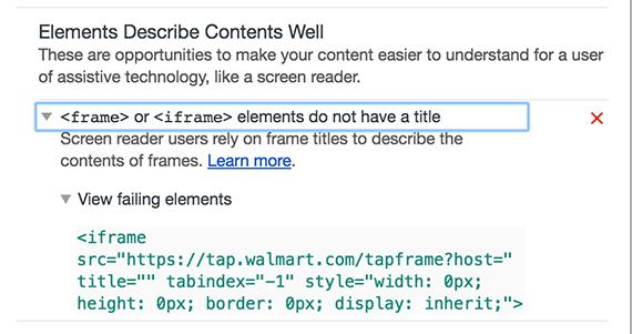 به عنوان مثال ما با حسابرسی والمارت از طریق Lighthouse که در 7 مه 2018 صورت گرفت، چند خطای دسترسی شامل یک iframe یافتیم. ابزار Lighthouse در توضیحات خطا اشاره میکند که این عنوان از دست رفته، درک صفحه را نسبتا سخت تر خواهد کرد.