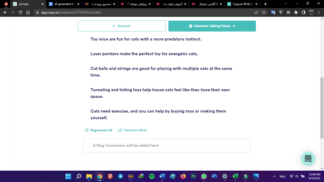 در مرحله بعد، پس از چند ثانیه گشت و گذار در محیط وب برای شما سر تیتر های هر پاراگراف را جمع آوری می کند. لطفا یکبار آنها را بخوانید یا در گوگل ترسلیت آنها را ترجمه کنید تا معنی مورد هدف شما را برسانند. اگر طولانی یا بی معنی بود فقط کافیه تا دکمه regenerate all  را بزنید تا از اپل برایتان بنویسید. اگر هم خوب و معنی دار بودند دکمه generate talking point  را بزنید و به مرحله بعد بروید.