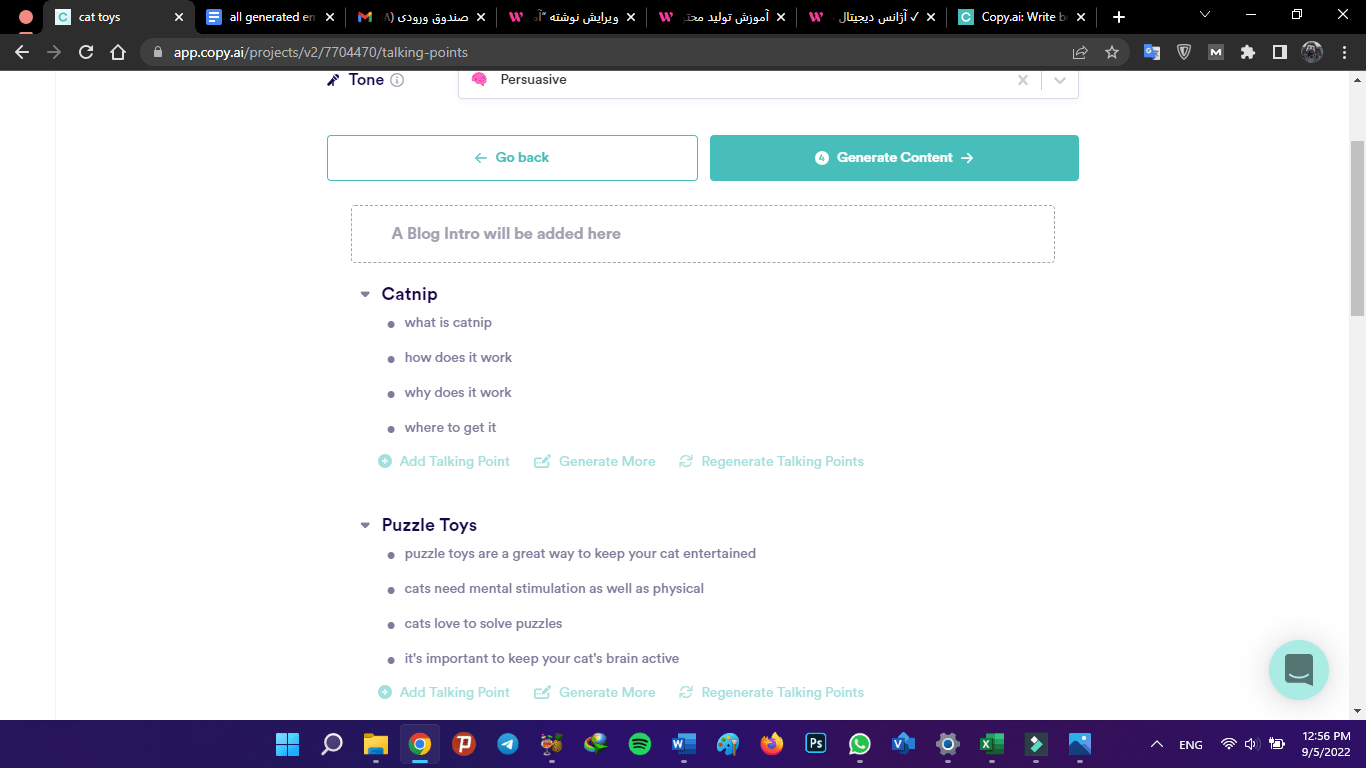 در این مرحله کار خاصی نیاز نیست انجام بدهید، چون فقط به شما توضیح می دهد که در هر پاراگراف قرار است به چه موضوعاتی اشاره کند و اگر نیاز به اضافه کردن توضیحات دارید حتما این کا را انجام بدهید. هنگامی که اصلاحات لازم انجام شد، دوباره دکمه generate content  را بزنید تا متن هر پاراگراف را بنویسد.