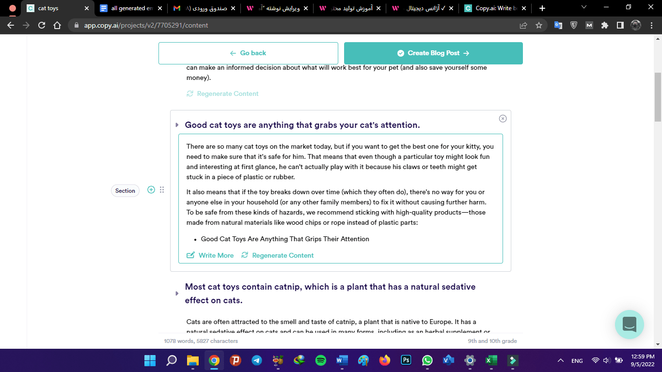 در مرحله آخر متن مورد نظر شما نوشته شده است و اگر کم است یا نیاز به بازنویسی دارد فقط کافیه تا با دکمه write more زیر هر پاراگراف متن بیشتری را بنویسد و با دکمه regenerate all از اول برایتان بازنویسی کند. در این مرحله تمامی اصلاحاتی که نیاز دارید را می توانید روی متن پیاده سازی کنید و در نهایت روی گزینه create blog post بزنید تا کار خود را به پایان برسانید.