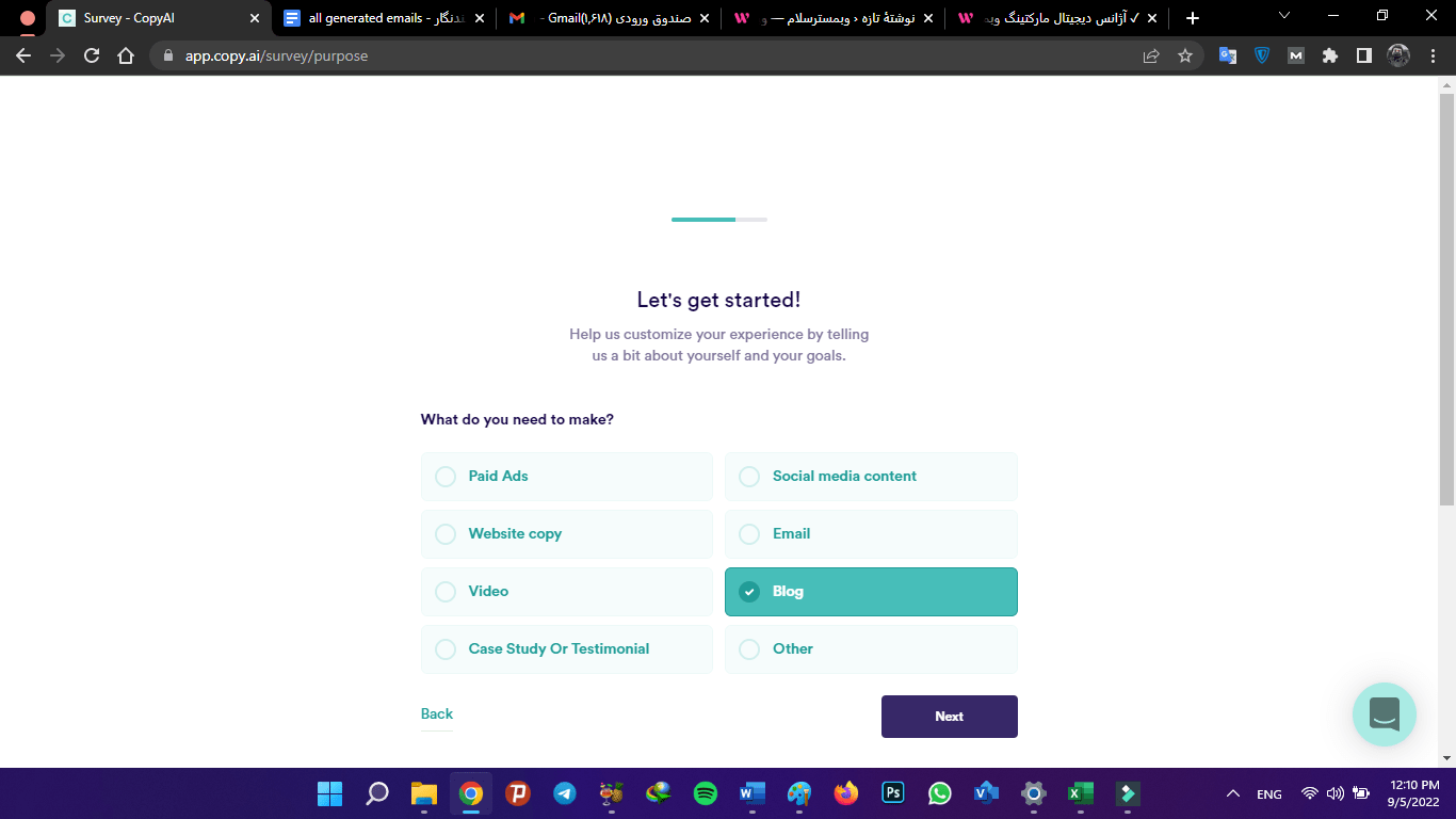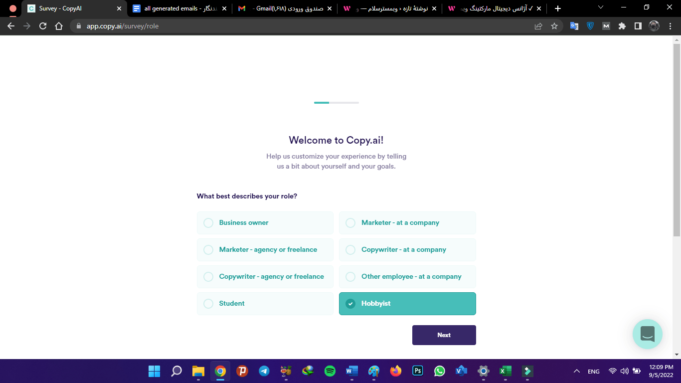 کمی صبر می کنیم تا کد برنامه به جیمیل فرستاده شود و بعد این که کد رو وارد کردیم، copy.ai  از ما ۳ سوال میپرسد: